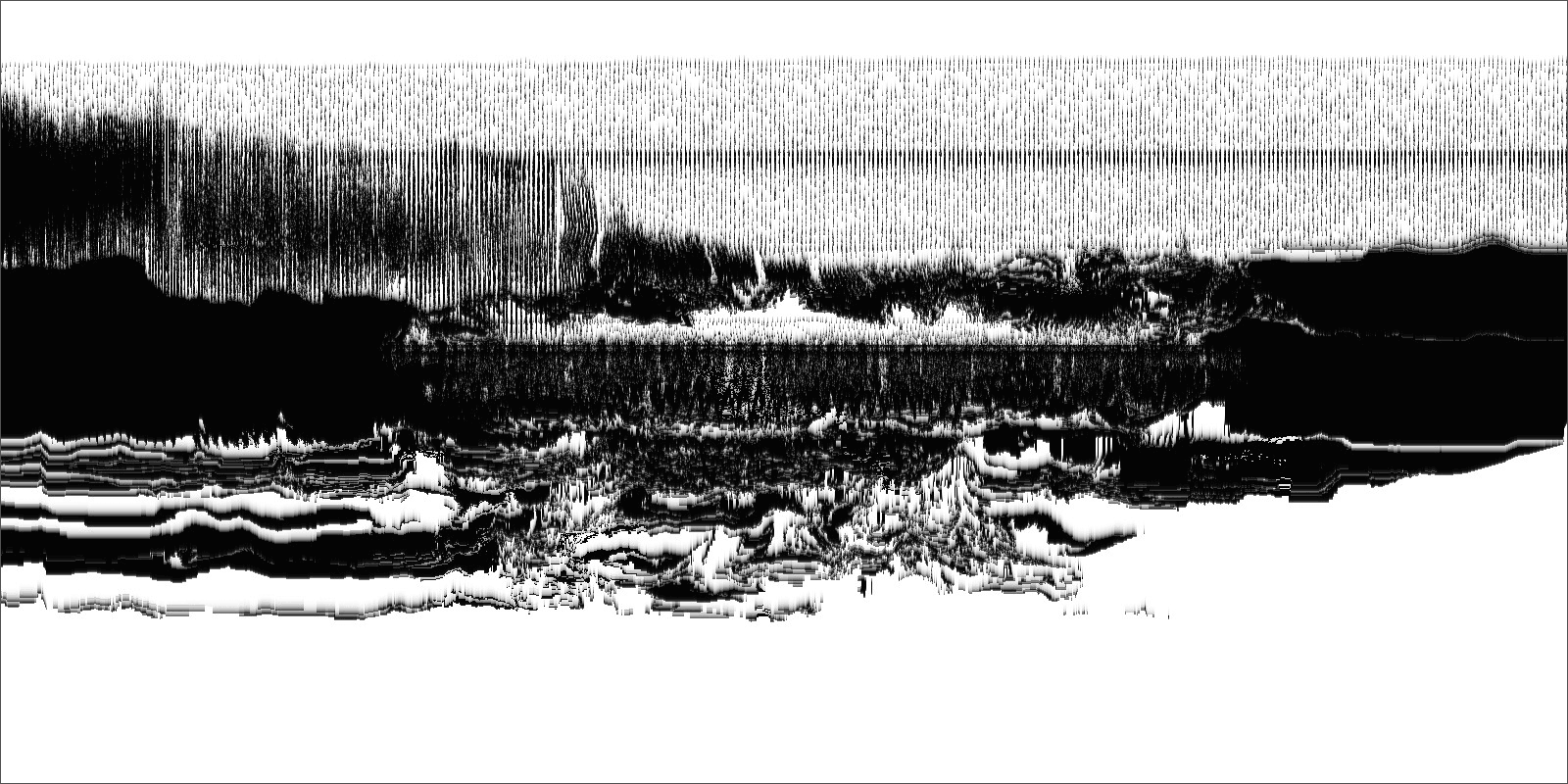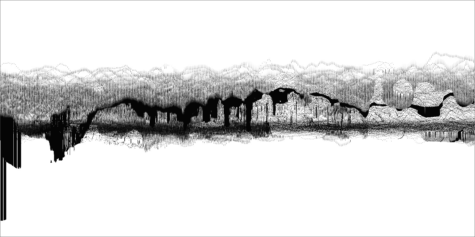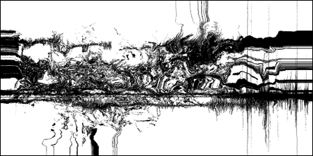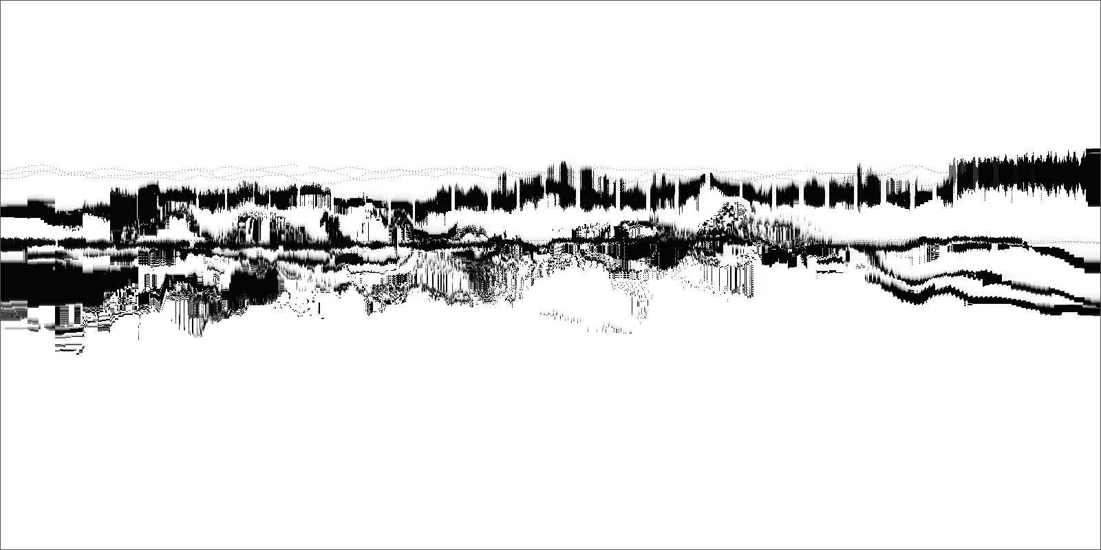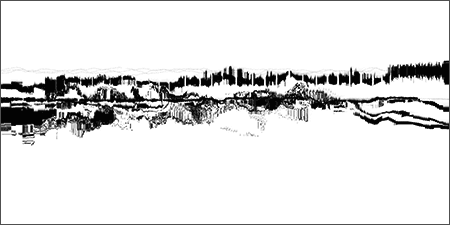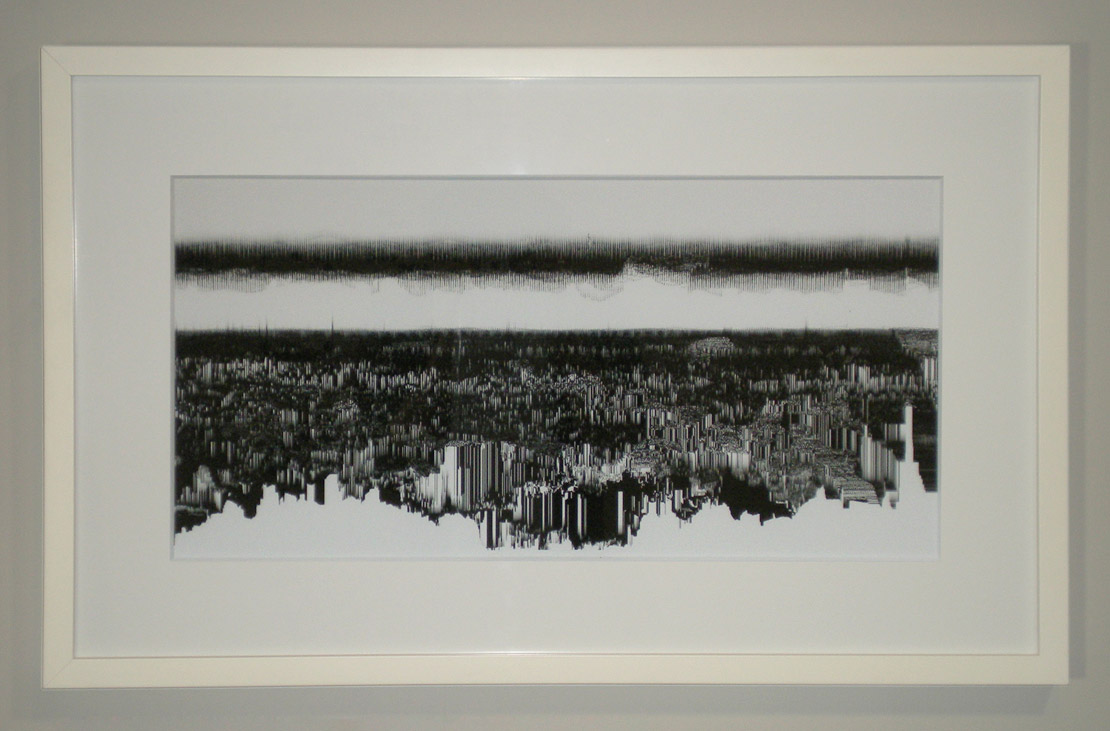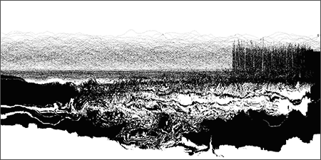 Loci_ is a series of prints generated by custom sound-to-image visualization software. Audio field recordings are fed into the system, converted to visual waveforms, then manipulated in real-time into abstract imagery that invokes the perception of landscape. There is a limited degree of control in this real-time manipulation, allowing for a range of unexpected effects to occur.